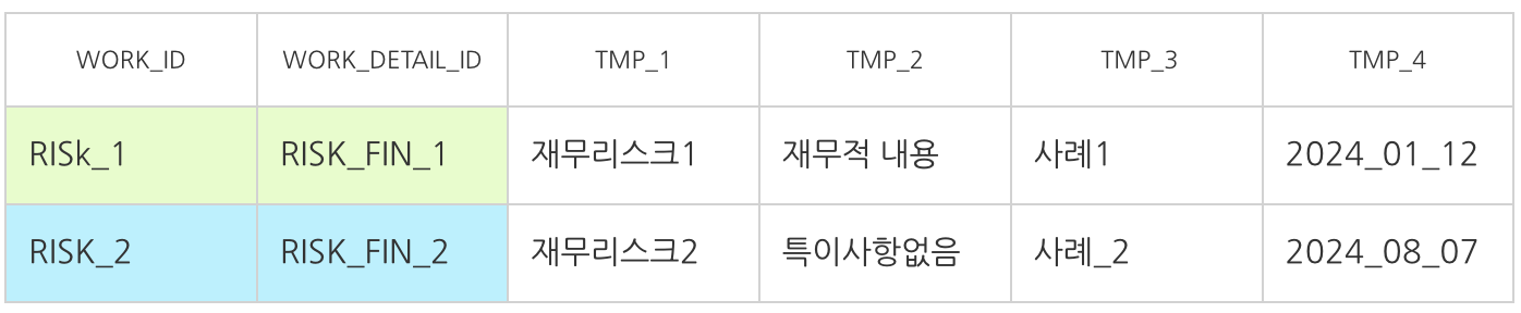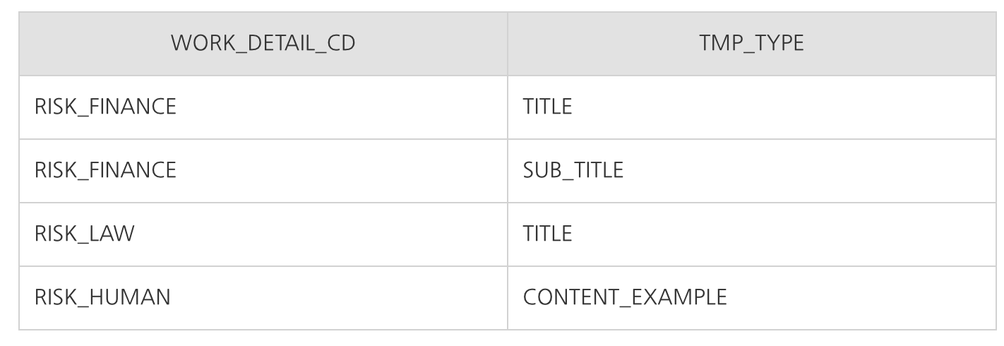 이 두 테이블에서 공통적으로 사용하는 컬럼은 WORK_DETAIL_CD이고 리스크 관리단 내에서 발생하는 여러 업무들을 또 분류해둔 타입니다. TEMPLATEDETAIL테이블 기준으로 설명을 하면 예를들어서 RISK_FINANCE는 재무적 리스크, RISK_HUMAN의 경우 사람이 발생 시킬 가능성이 있는 리스크를 분류한것이다. 각 리스크마다 보여줘야할 내용들이 다르다. 제목만 보여줄지, 사례까지 같이 보여줄지는 각 영역마다 다른데 공통분류는 WORK_DETAIL_CD로 하기 때문에 이 컬럼을 인덱스로 지정하였다.