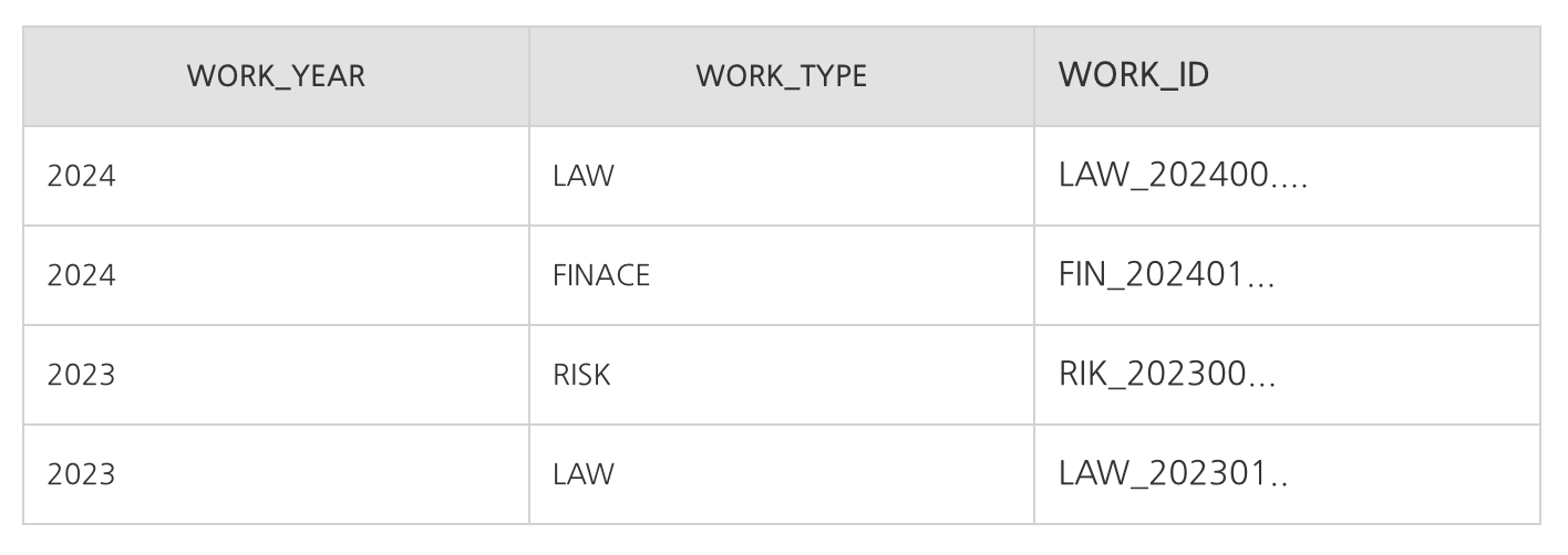 이런식으로 연도별, 업무타입별로 업무가 나뉘고. 해당 개별 업무는 고유의 ID값을 갖게 된다.