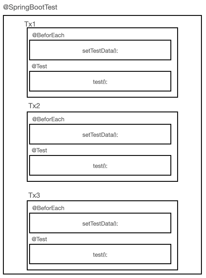 일반적인 테스트 환경에선 Tx1 트랜잭션 내에서 setTestData()로 데이터를 넣어주면 해당 데이터는 동일 트랜잭션에서 넣어준 데이터이기에 test()에서 조회가 가능하고 Tx1이 종료가 되면 넣어준 데이터는 롤백이 된다. 해당 시퀀스가 Tx2, Tx3에서 반복이 된다.