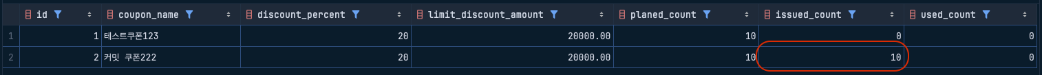 처음엔 상단의 @Transactional이 없는 상태로 테스트를 하였는데, 데이터를 정리하는과정이 번거로워 자동 롤백기능을 사용하고자 @Transactional을 달았는데 그때부터 테스트가 깨지기 시작하였는데, DB에 기록된 쿠폰 발급수량은 10장이 아니라 0장으로 나오는 현상이 발생하였다.