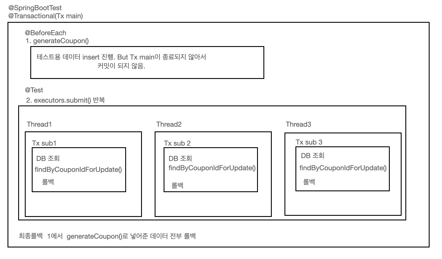 Spring의 트랜잭션은 ThreadLocal 기반으로 관리가 되기때문에 Tx main 트랜잭션에서 generateCoupon()으로 쿠폰데이터를 생성을 하였지만 ExecutorService로 새로운 쓰레드를 생성하게 되고 해당 쓰레드에서 새로운 트랜잭션들이 생겨나게 된다. Tx main과 Tx sub1, Tx sub2, Tx Sub3는 각각 다른 트랜잭션으로 갈라지게 된다. Tx sub 1 내에서 findByCouponIdForUpdate()를 진행하게 되면 Tx main과의 컨택스트가 끊어지게 되어서 generateCoupon()으로 만들어진 쿠폰 데이터를 조회하는게 불가능하다. 실제 DB에서 스냅샷을 찾게 되는데, DB에는 넣어준적 없는 데이터를 찾으라고 하니 예외가 발생하는것이다.